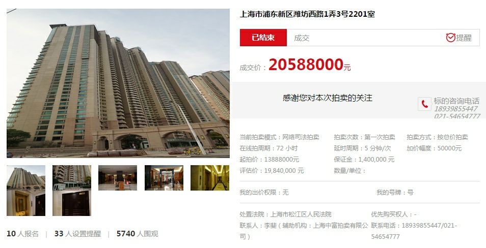 近日宣和资产某基金对应的不良债权包中,上海市浦东新区潍坊西路1弄有一套232.56平米的房子拍卖结束,共吸引了5740次围观,10个人报名,112次加价,每次加价幅度是5万元。该房屋评估价是1984万元,折合单价是8.53万元/平米,最终成交价2058.8万元,单价8.85万元/平米。